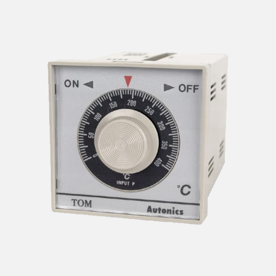 TOM-F3RJ3C Control temperatura análogo sin indicación. Ciclo de muestreo de 100ms. Tamaño DIN 72WX72H con profundidad de 64.5Dmm. Salida de control tipo: relevador. Rango de ajuste de temperatura: 0-300°C. Tensión de alimentación: 100-240VCA. Métodos de control: ON/OFF, control PID. Entrada de sensor tipo: J.
