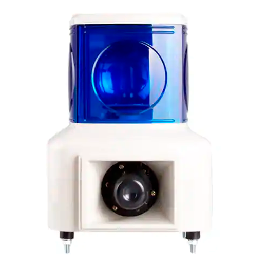 Lámpara incandescente de torre de forma cuadrada de 140mm por lado. Reflector tipo giratorio + Zumbador. Nivel de sonido del timbre de 100dB con 5 tipos de sonidos. Con 1 módulo luminoso color Azul. Tensión de alimentación: 110VCA. Temperatura de operación: -15°-40°C. Material: Policarbonato. Grado de protección: IP20.