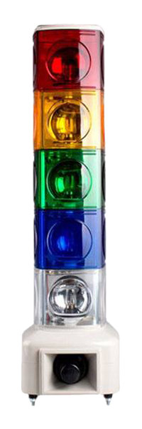 Lámpara incandescente de torre de forma cuadrada de 140mm por lado. Reflector tipo giratorio + Zumbador. Nivel de sonido del timbre de 100dB con 5 tipos de sonidos. Con 5 módulos luminosos (Rojo, Amarillo, Verde, Azul y transparente). Tensión de alimentación: 110VCA. Temperatura de operación: -15°-40°C. Material: Policarbonato. Grado de protección: IP20.