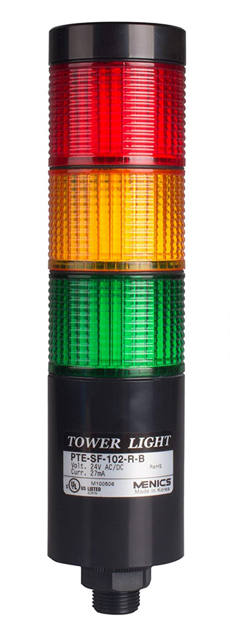 Lámpara LED de torre (diseño de domo) con montaje directo/conexión terminal de 56mm diámetro. Fija / Intermitente. Con 3 módulos luminosos (Rojo, Amarillo, Verde). Tensión de alimentación: 24VCA/CD. Temperatura de operación: -15°-40°C. Material: Policarbonato. Grado de protección: IP65.
