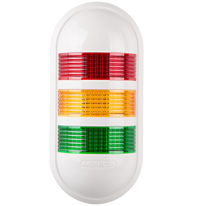 Torreta delgada de montaje en pared de 90mm diámetro. Fija / Intermitente + Zumbador. Nivel de sonido del timbre de 85dB. Con 3 módulos luminosos (Rojo, Amarillo, Verde). Tensión de alimentación: 24VCA/CD. Temperatura de operación: -15°-40°C. Material: Policarbonato. Grado de protección: IP65.