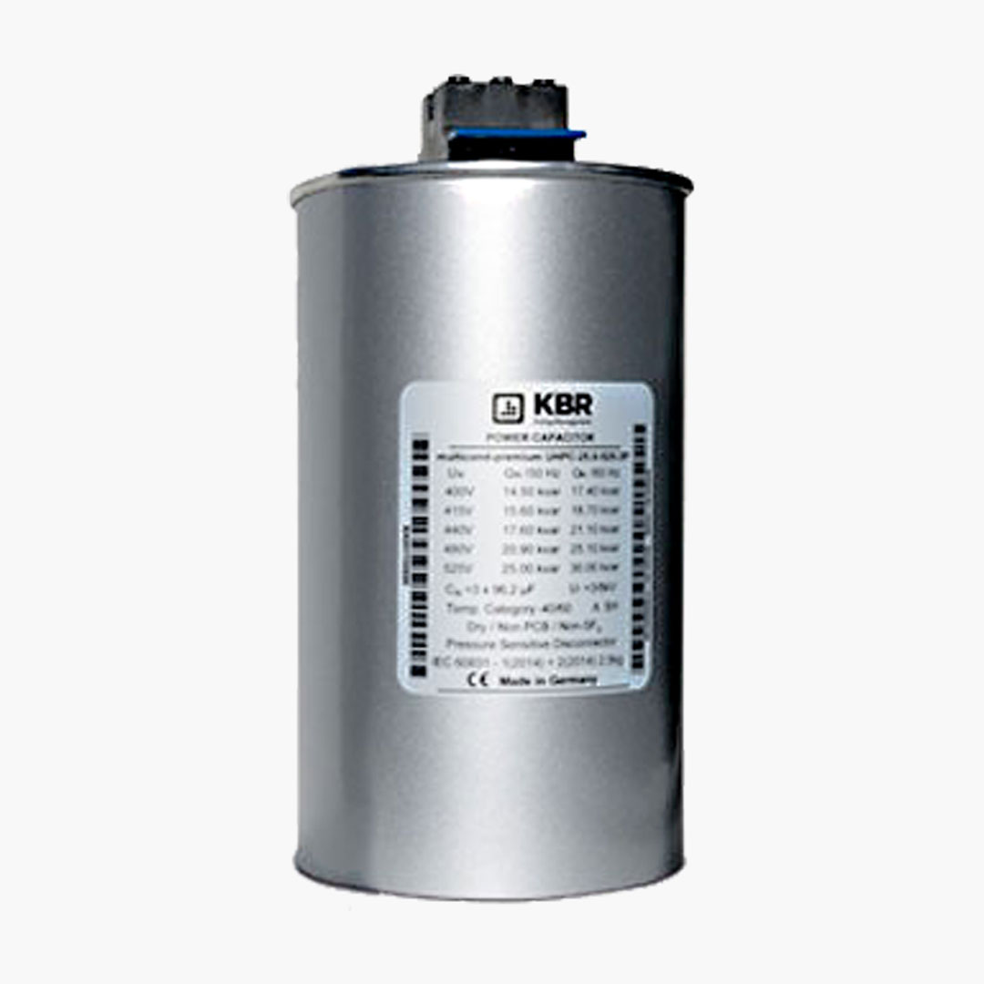 Premium UHPC-25.0-525-3P Capacitor de potencia trifásico para corrección de factor de potencia. Potencia de 25kVAR a una tensión de operación de 525VCA. Capacitancia nominal: 3x96.2µF. Máxima corriente a máxima tensión de 33A.