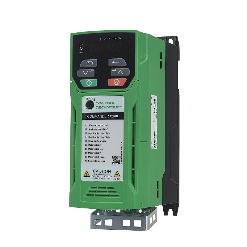 Variador de frecuencia de alta resistencia y fiabilidad con PLC y reactor de línea integrado. Tensión de entrada 200-240VCA±10% a 1/3 fases. Salida a una tensión 220VCA a 3 fases. Capacidad uso pesado: corriente máxima 2.4A; potencia 0.37kW (0.5HP). Alta