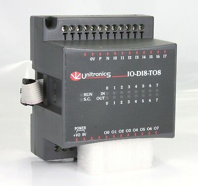 Vision™ Módulo I/O de expansión. Cuenta con 8 entradas digitales PNP o NPN (posibilidad de configurar una entrad de contador rápido HSC de 5 kHz a 16 bits) y 8 salidas digitales tipo transistor PNP. Tensión de alimentación: 24VCD. Para usarse con las series Vision™.