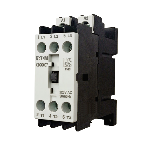 XTCG009B00A0 Contactor trifásico, tensión de bobina de 220VCA, indicado para una carga de 9A, 1/2HP a 120VCA 1PH/3HP a 220VCA/5HP a 440VCA, temperatura de operación de -25~+55, grado de protección IP20, cumple con los estándares IEC/EN 60947, VDE 0660, UL, CSA.