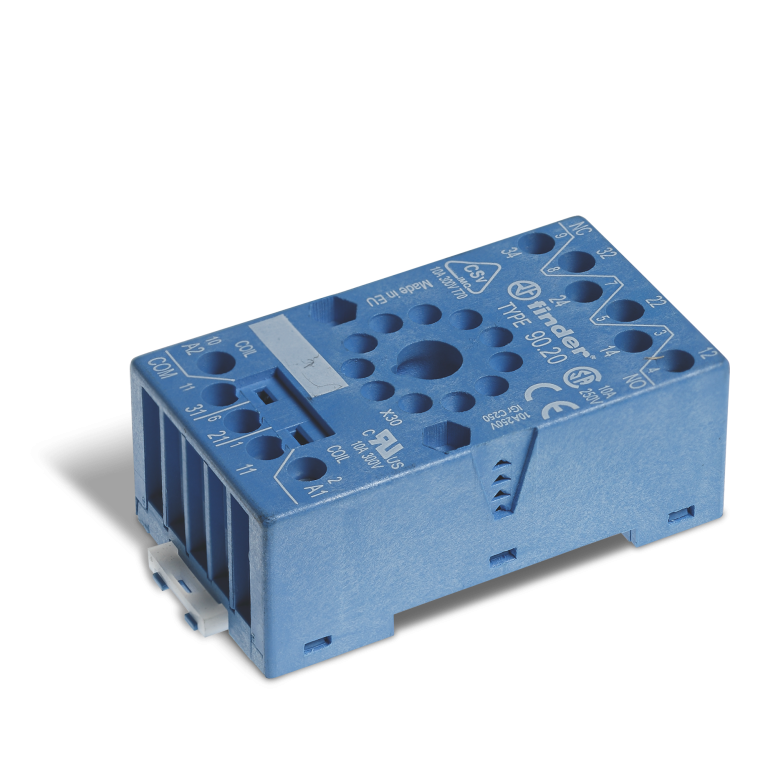 90.20.SMA Zócalo con bornes de jaula, para el montaje de relevadores tipo 60.12. Suministrado con brida de retención metálica. Color azul. Diseñado para soportar una carga de 10A a 250V. Montaje en panel/riel DIN. Aprobaciones: CE, UKCA, CSA, VDE, IMQ, UL.