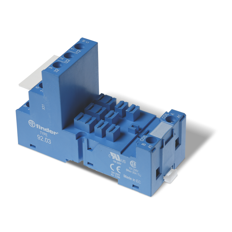 92.03.SMA Zócalo con bornes de jaula, para el montaje de relevadores tipo 62.31/32/33. Suministrado con brida de retención metálica. Color azul. Diseñado para soportar una carga de 16A a 250V. Montaje en panel/riel DIN. Aprobaciones: CE, UKCA, CSA, IMQ, UL.