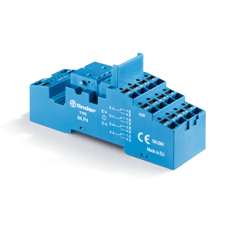 94.P4.SPA Zócalo con bornes push-in, para el montaje de relevadores tipo 55.32/34. Suministrado con brida de retención plástica. Color azul. Diseñado para soportar una carga de 10A a 250V. Montaje en panel/riel DIN. Aprobaciones: CE, UKCA, CSA, EAC, IMQ, UL.