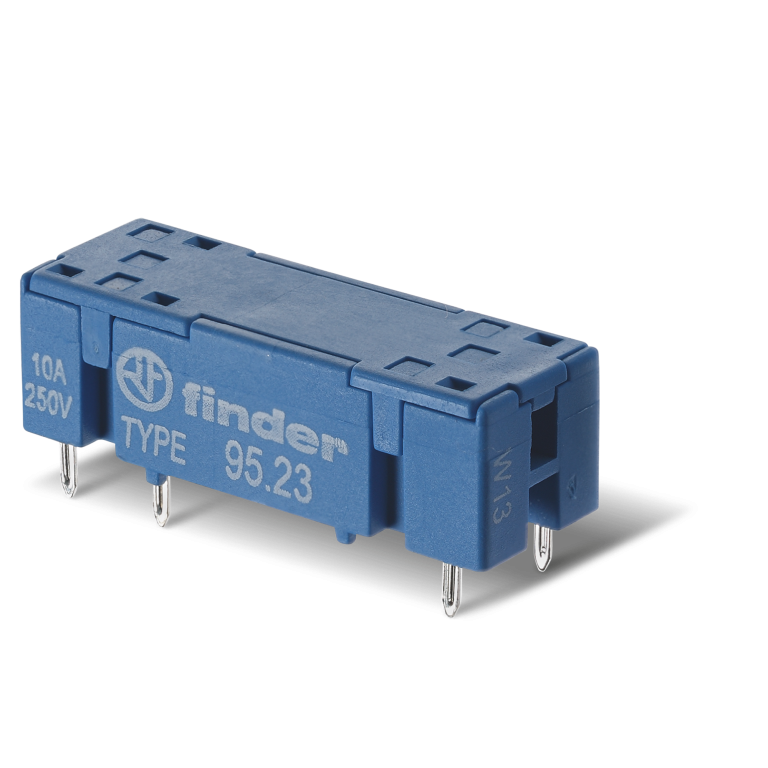 95.23.SNA Zócalo para circuito impreso (solo para tipo contacto conmutado), para el montaje de relevadores tipo 43.41. Suministrado sin brida de retención. Color azul. Diseñado para soportar una carga de 10A a 250V. Montaje en Circuito impreso. Aprobaciones: CSA, EAC, UL.