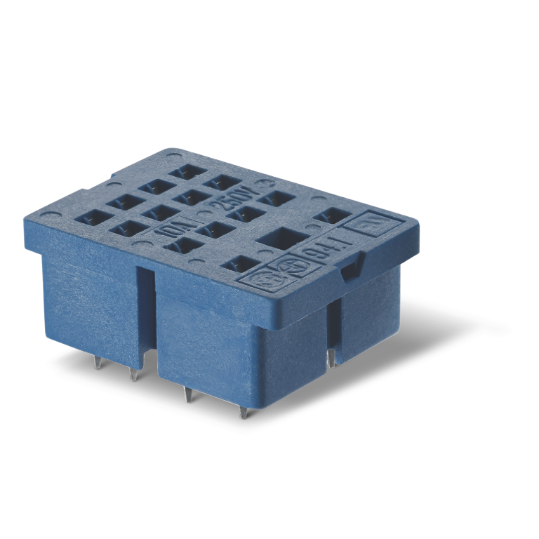 94.13.SMA Zócalo para circuito impreso, para el montaje de relevadores tipo 55.33. Suministrado con brida de retención metálica. Color azul. Diseñado para soportar una carga de 10A a 250V. Montaje en Circuito impreso. Aprobaciones: CSA, EAC, UL, IMQ.