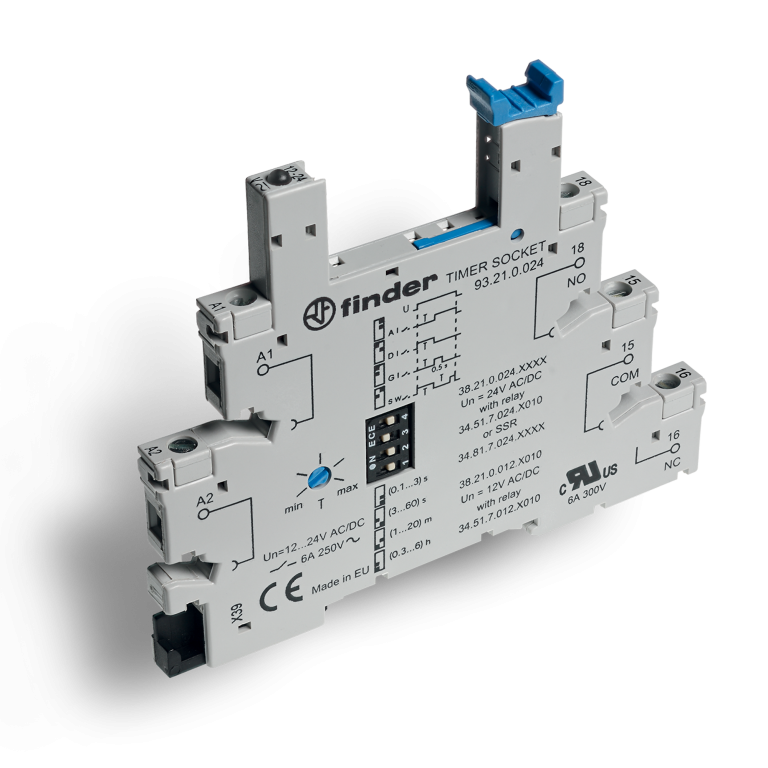 93.21.0.024 Zócalo temporizado con bornes de jaula, para el montaje de relevadores tipo 34.51/81 con tension de mando de 24VAC/DC. Extracción y fijación del relé con clip de plástico. Color gris. Diseñado para soportar una carga de 6A a 250V. Montaje en riel DIN. Aprobaciones: CE, UKCA, EAC, UL.