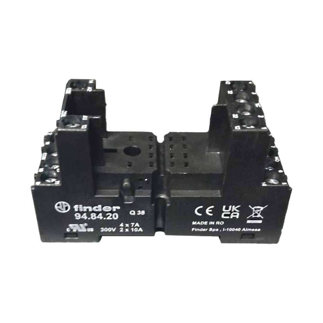 94.84.20 Zócalo con bornes de jaula, para el montaje de relevadores tipo 55.32/34. Suministrado con brida de retención plastica. Color negro. Diseñado para soportar una carga de 10A a 250V. Montaje en panel/riel DIN. Aprobaciones: CE, UKCA, EAC, UL.